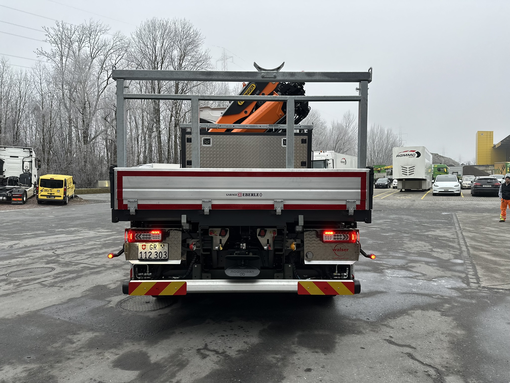 Le véhicule a été construit par Walser GmbH avec un pont robuste et une grue. Des équipements supplémentaires tels que le système de freinage suisse, des raccords hydrauliques pour les remorques à enrouleur à l'avant et à l'arrière, ainsi que l'accès côté passager avec marchepied dans le réservoir en aluminium garantissent sécurité, efficacité et confort d'utilisation. Avec un poids à vide de 13 700 kg et une charge utile d'environ 4 300 kg, le véhicule est parfaitement adapté aux exigences de la construction de réseaux.